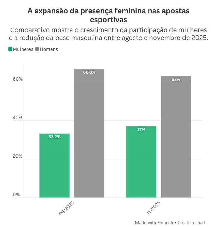 Dados exclusivos do Painel das Bets, ferramenta do Aposta Legal para acompanhar o mercado, mostram que, em 2025, o público feminino representou 37% dos apostadores online no país, considerando apenas as casas legalizadas. No ano anterior, essa participação era de 33,2%, enquanto os homens caíram de 66,8% para 63%.